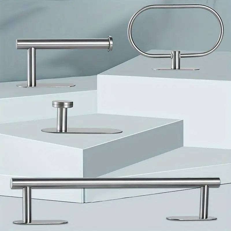 L'ensemble porte serviette est composé de barres, d'anneaux et de crochets ingénieux. Sa conception en inox assure une résistance accrue face à l'humidité. Ce système auto adhésif permet une pose rapide, sans abîmer les murs. Chaque pièce trouve sa place dans un espace minimaliste.