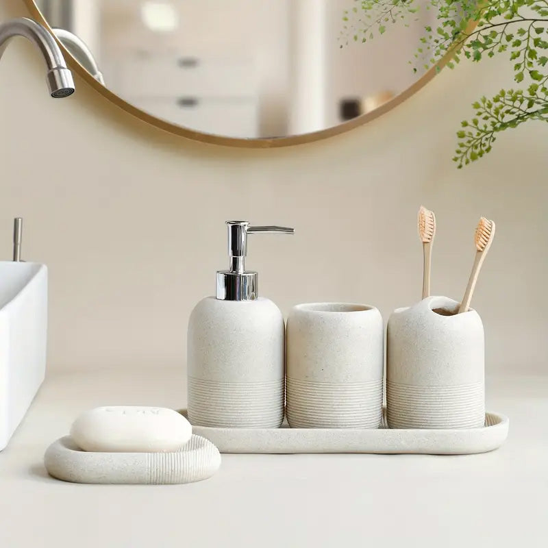 Cet ensemble inclut un porte savon, un distributeur de savon liquide, un porte brosse à dents, une tasse de bain de bouche et un vide poche. Chaque pièce est réalisée en résine, garantissant durabilité et esthétisme. Offrez à votre salle de bain une organisation optimisée et stylée.
