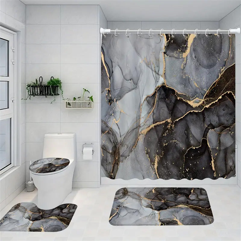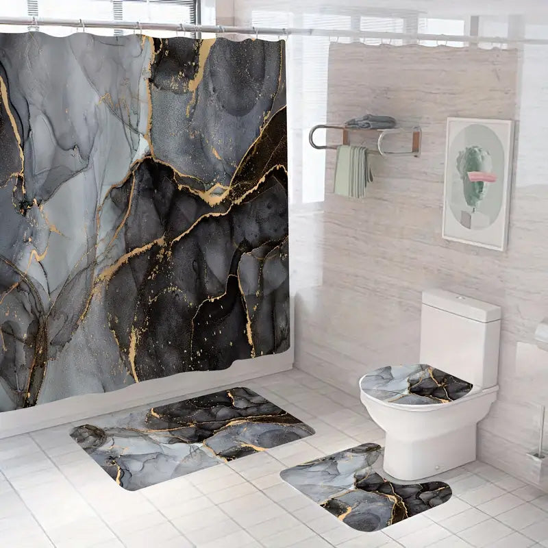Ensemble Rideau de Douche à Motif Marbre 4 pièces