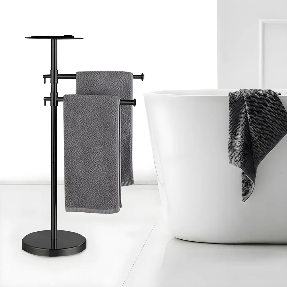 (132)Découvrez notre porte serviette sur pied en inox avec plateau. Élégant et pratique pour organiser vos serviettes et accessoires dans la salle de bain.